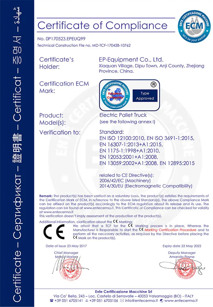Сертификат EP-Equipment электрического паллетоукладчика